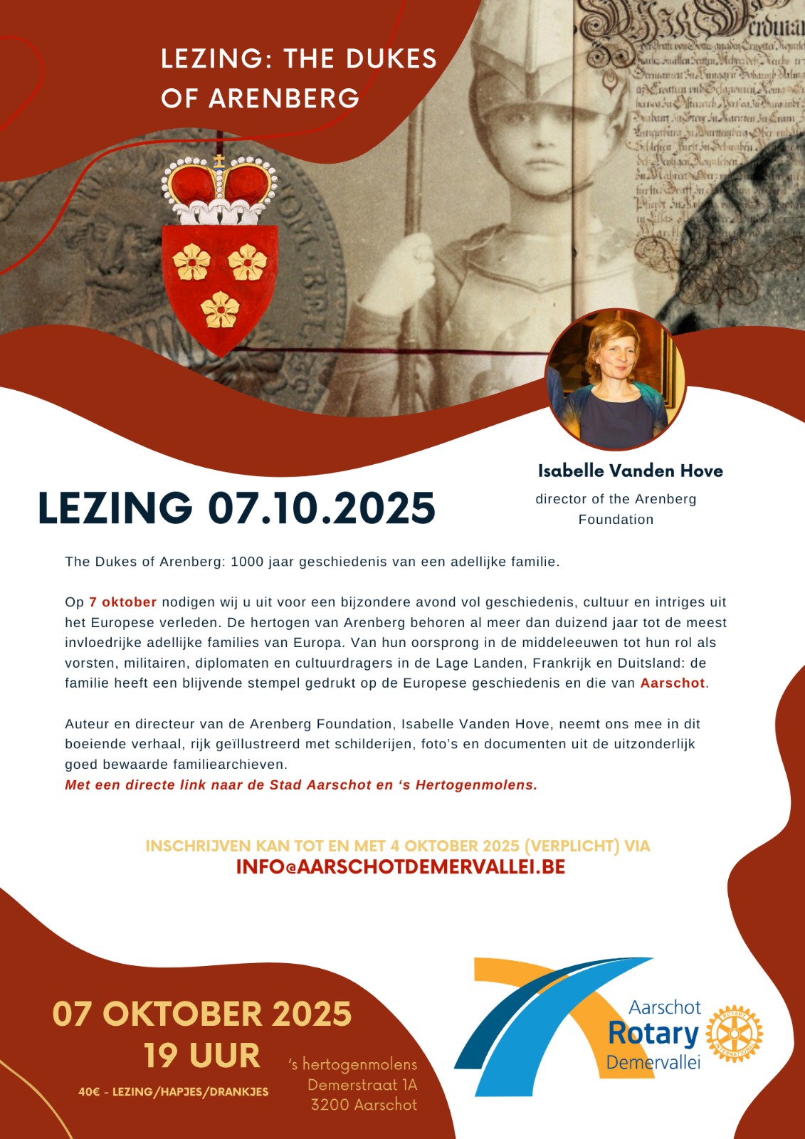 - Aarschot (lecture in Dutch): Tuesday 7 October 2025, at 7:30 PM at Brasserie's Hertogenmolens (Demerstraat 1, 3200 Aarschot), in collaboration with Rotary Demervallei (Aarschot). Registration required via info@aarschotdemervallei.be. Upon registration, you will receive more information about the participation fee. A meal will in any case be provided for the participants.